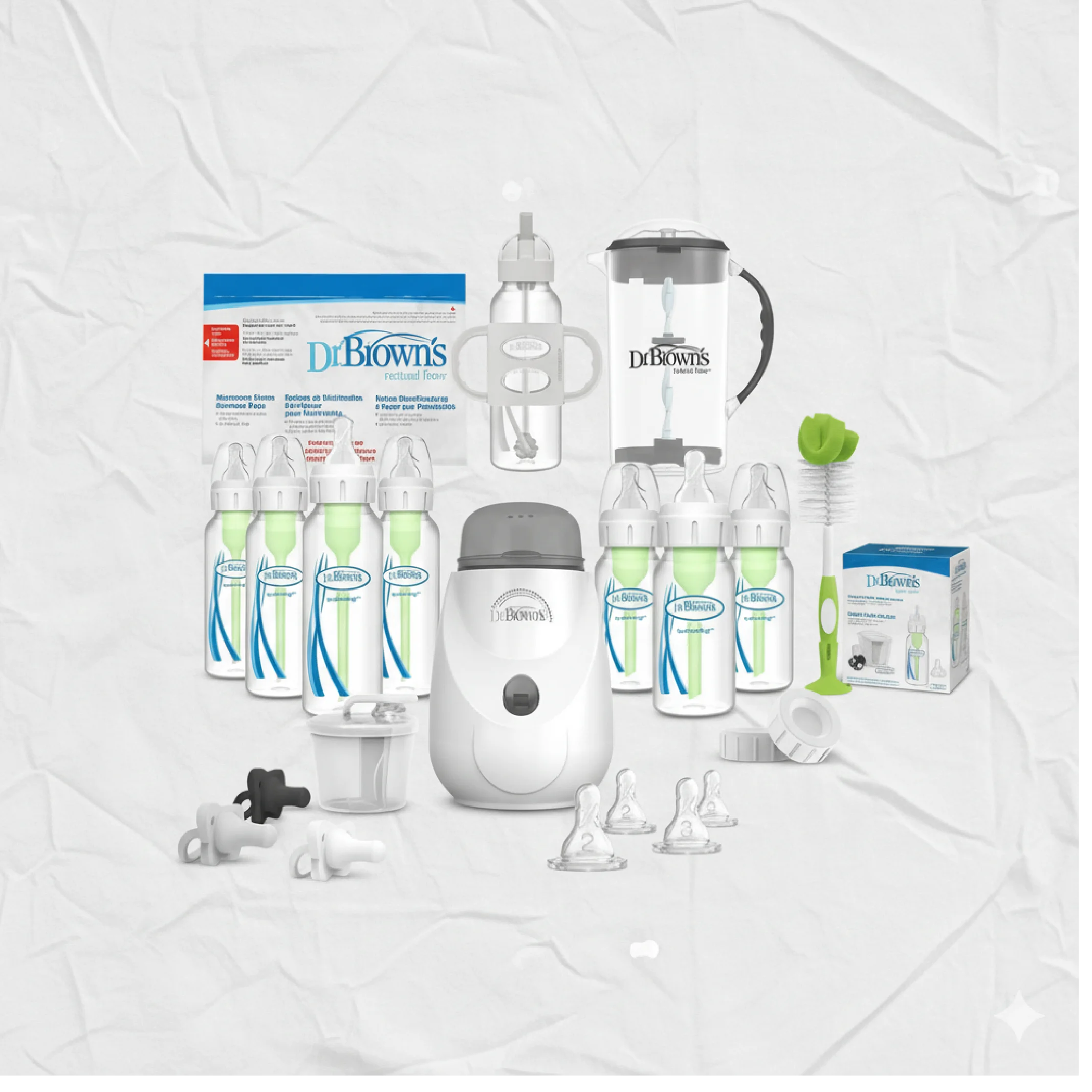 • Cleaning & Sterilizing Tools: Bottle brush, cleaning brushes, and microwave steam sterilizer bags