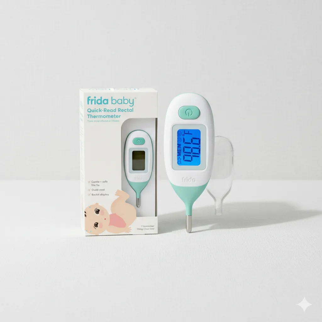 Ensure precise and reliable temperature readings for your little one with the Frida Baby Rectal Thermometer for Babies. Specially designed for newborns and infants, this digital thermometer provides fast and accurate temperature checks, helping parents monitor fever with confidence. The gentle, baby-safe design, water-resistant build, and memory function that stores the last 10 readings make it a dependable essential for every baby care kit. Complete with a clear protective case, it offers hygienic storage and easy portability for everyday use.